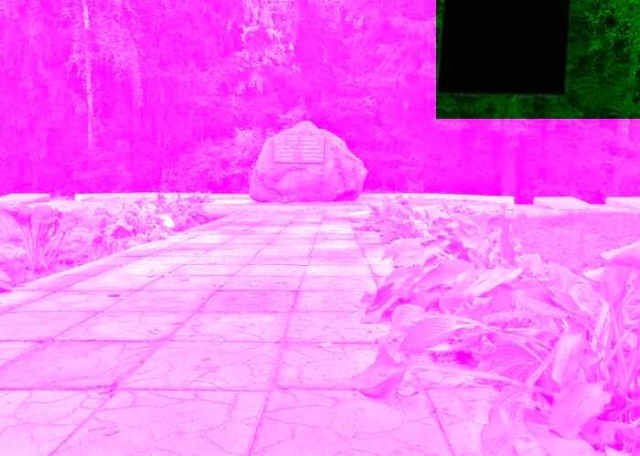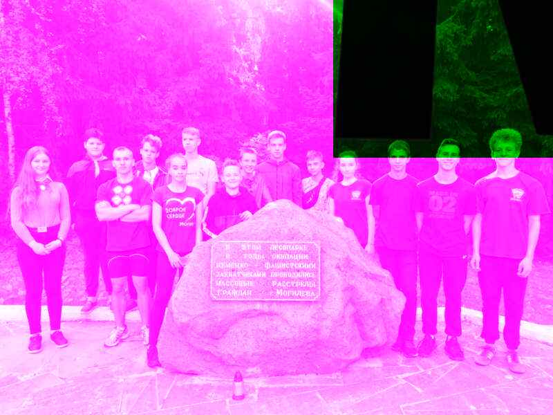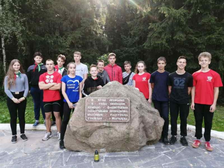 Мы стоим возле него, в лесу стоит настоящая благодать. Деревья одеты в ярко-зелёное убранство, мягкая трава стелется по земле. Воздух наполнен запахом трав и разогретой солнцем древесины. Сейчас и не скажешь, а в далёком 1941 году немцы тут расстреливали военнопленных и мирных жителей. В 2019 году, в год 75-летия освобождения Беларуси от немецко-фашистских войск волонтёры облагородили место вокруг мемориального знака.